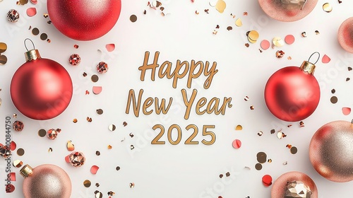 Elegant New Year banner featuring bright coral and bright red baubles, delicate rose gold confetti, "Happy New Year" in a small serif font, and "2025" in bold gold typography.