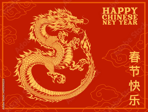 elegant new year chinese dragon 2024, zodiac sign year of dragon with clean background red and white with chinese pattern element border with font layout