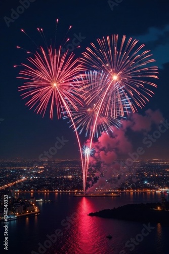 Elegant New Year's Eve fireworks display over a sparkling cityscape, glittering lights, urban landscape