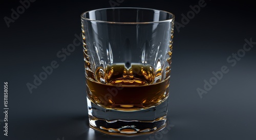 Elegant Old Fashioned Whiskey Glass with Amber Liquor on Dark Reflective Surface, Showcasing Classic Lowball Design and Rich Golden Tones