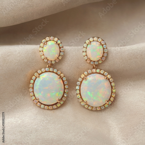 Elegant Opal Drop Earrings with Halo Design, Stunning Iridescent Jewelry on Neutral Fabric Background