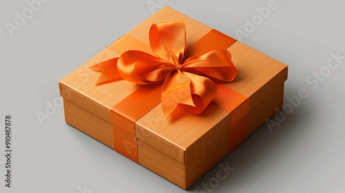 Elegant orange golden gift box with ribbon on neutral background