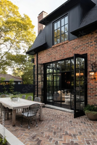 Elegant outdoor dining area adjacent to a brick home with large glass doors, featuring rustic wooden table and metal chairs, surrounded by greenery, late afternoon light illuminating the space