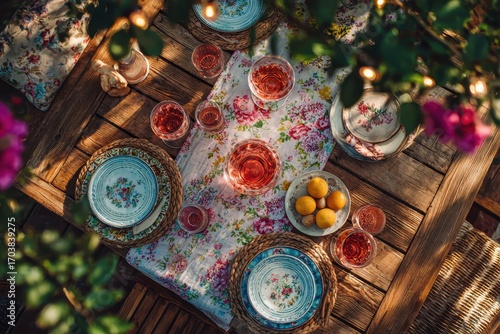Elegant Outdoor Tea Party with Floral Accents and Wooden Table.