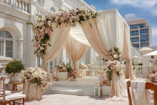 Elegant outdoor wedding ceremony setup with floral decor and draped fabrics