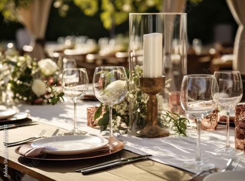 Elegant outdoor wedding reception table setting with candles, flowers, and glassware, creating a romantic ambiance.