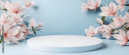 Elegant Pastel Pink Magnolia Flowers and Light Blue Round Pedestal Display