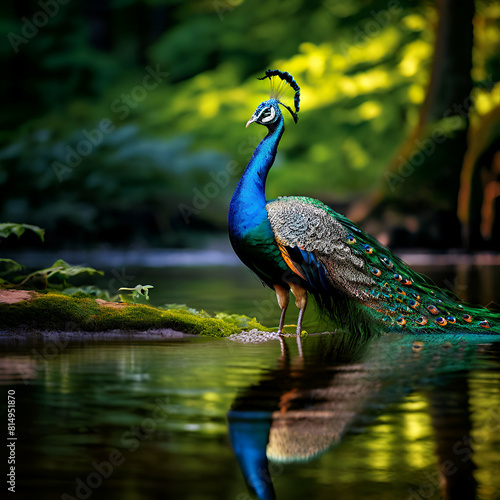 elegant peacock standing by the water amidst the forest natures beauty captured in vibrant colors,generate ai