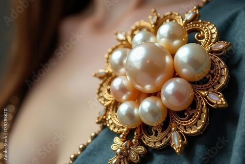 Elegant Pearl and Gold Brooch Adorning a Delicate Neckline, a Luxurious Accessory for Special Occasions