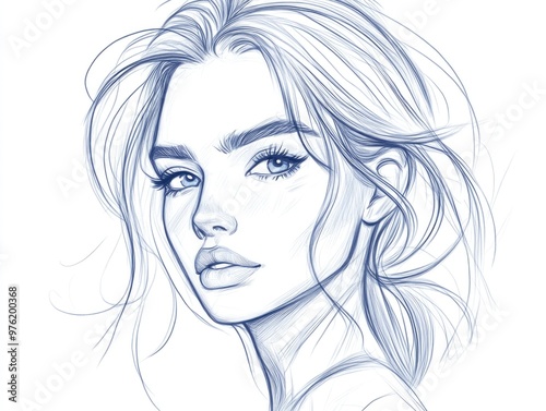 Elegant pencil sketch of a thoughtful woman with flowing hair
