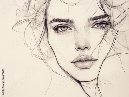 Elegant pencil sketch of a woman's face with intense eyes and flowing hair