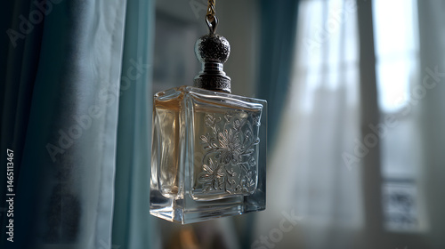 Elegant Perfume Bottle: A close-up of a delicate perfume bottle, its intricate design catches the light, symbolizing beauty and luxury, creating an air of sophistication.