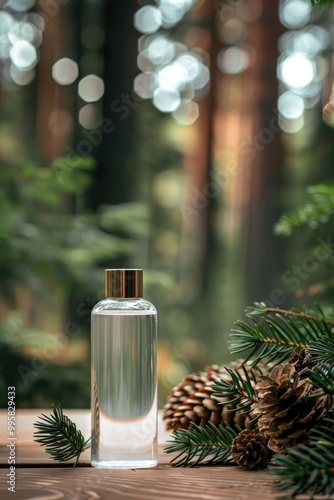 Elegant Perfume Bottle in Forest Setting with Pine Cones and Natural Elements