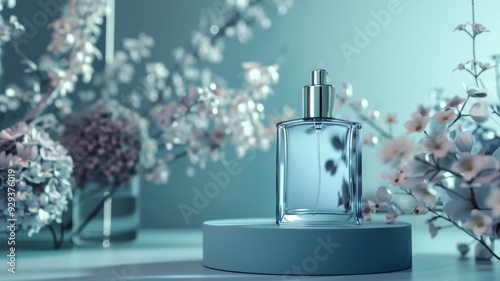 Elegant perfume bottle on a blue pedestal surrounded by delicate flowers, creating a serene and sophisticated atmosphere