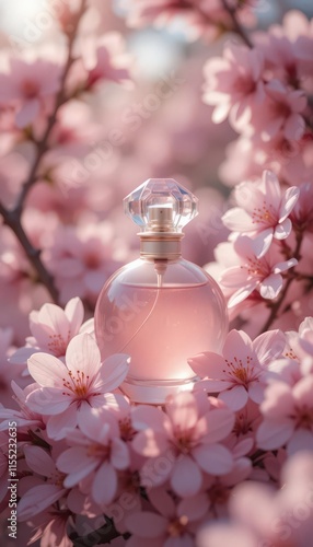 Elegant perfume bottle surrounded by delicate pink cherry blossoms.