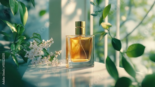 Elegant perfume bottle surrounded by greenery and flowers.