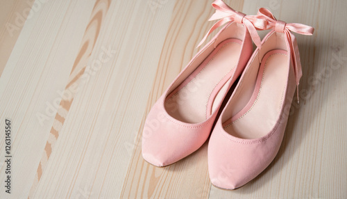 Elegant pink ballet flats on polished wooden floor, Spring wardrobe