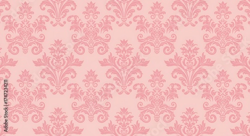 Elegant pink damask wallpaper pattern with intricate floral motifs, vintage design