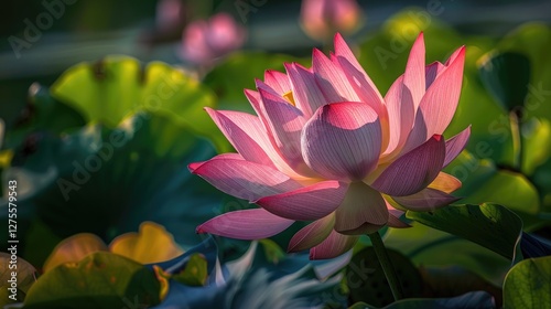 Elegant pink lotus flower in the foreground with vibrant green lily pads, softly illuminated by natural light in a serene garden setting.