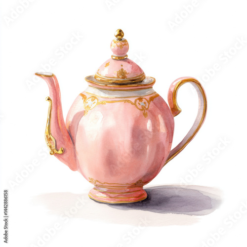 Elegant pink porcelain teapot with gold trim and ornate handle casting subtle shadow on white background