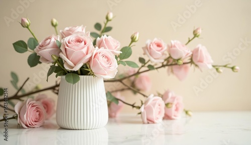 Elegant Pink Roses in a White Vase on a Marble Surface