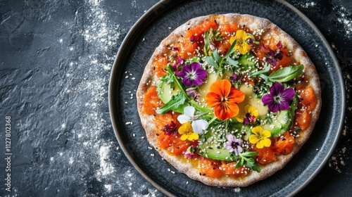 Elegant plate with salmon tartare garnished with edible flowers, avocado puree, and a sprinkle of sesame seeds