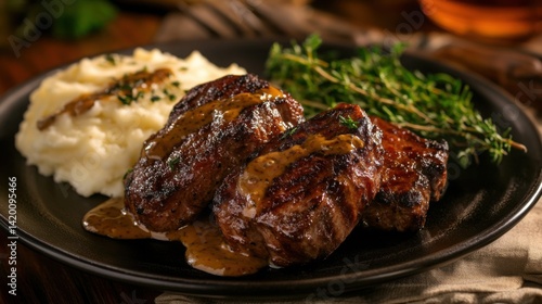 Elegant plating of lamb chops with bold mustard sauce and creamy mashed potatoes. Studio-lit from the right to create a realistic