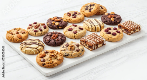 Elegant Platter of Assorted Gourmet Cookies and Brownie Bars with Nuts, Chocolate, and Dried Fruit on a White Marble Surface