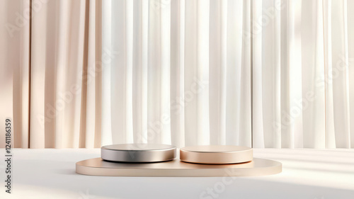 Elegant podium with metallic finish on a smooth, sleek stage, subtle reflections and minimal design for premium product presentation