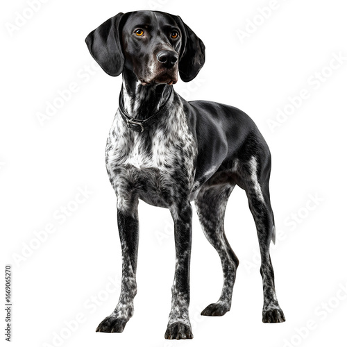 Elegant Pointer dog with striking black and white coat stands attentively against a clean white background.