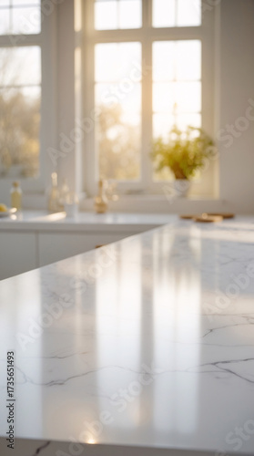 Elegant polished marble countertop styled cleanly in bright white contemporary kitchen tabletop modern home interior design wallpaper background