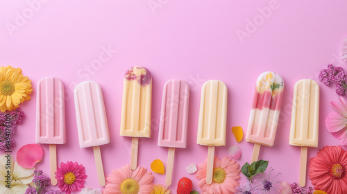Elegant Popsicles with Edible Flowers and Fruits on Pink Background – National Ice Cream Day