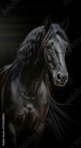 Elegant portrait of a majestic black horse with a luxurious flowing mane