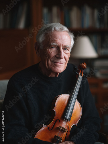 Elegant portrait of a senior musician holding a violin. Evokes wisdom, passion, artistry, and a lifetime dedicated to music. Ideal for arts, culture, or lifestyle concepts.