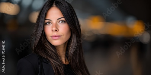 Elegant Portrait of a Young Woman with Long Dark Hair in a Softly Blurred Background