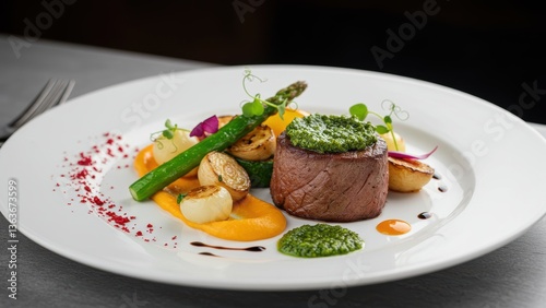 Elegant presentation of steak filet mignon with chimichurri sauce and vegetables.