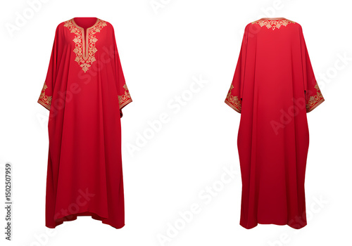 Elegant Red Kaftan Dress Embroidered Maxi Dress for Women isolated on transparent background