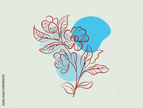 Elegant Red Line Art Flowers with Blue Abstract Background