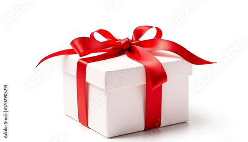 Elegant red ribbon tied atop a square gift box, isolated on white, retail, product photography