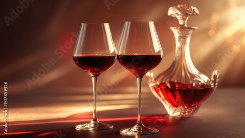 Elegant red wine decanter with glass on rustic stone backdrop
