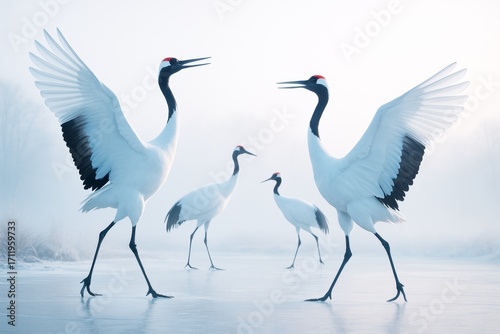 Elegant red-crowned cranes dancing gracefully on frozen lake with soft mist and winter light background, symbolizing harmony and balance. Ai generative