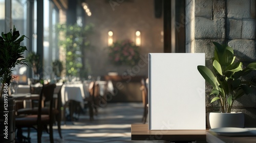 Elegant restaurant interior with empty menu on wooden table and decorative plants in a bright, inviting atmosphere