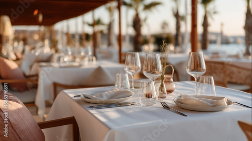 Elegant restaurant table setting features wine glasses and formal dining arrangements.