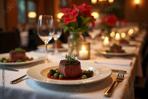 Elegant restaurant table setting with gourmet steak dinner and romantic ambiance