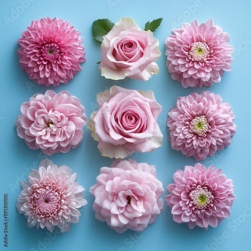 Elegant rose flowers arranged on a bright blue pastel background, emphasizing beauty and grace. Great for feminine, festive, or lifestyle designs.
