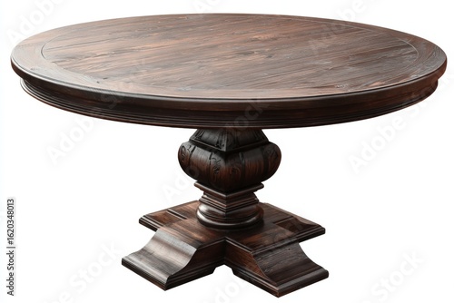 Elegant round wooden dining table with intricate base, perfect for family gatherings in a cozy home setting