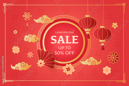 Elegant sale banner with oriental paper-cut flowers, stars, and clouds on a red background. Features traditional lanterns and lucky symbols, perfect for Lunar New Year promotions.