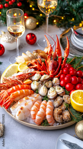 Elegant seafood platter for traditional christmas celebration with festive décor
