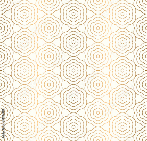Elegant seamless pattern featuring gold line in floral shape and arranged in hexagon form on a white background.
