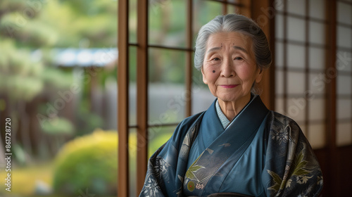 Elegant Senior Japanese Woman in Traditional Kimono Indoors